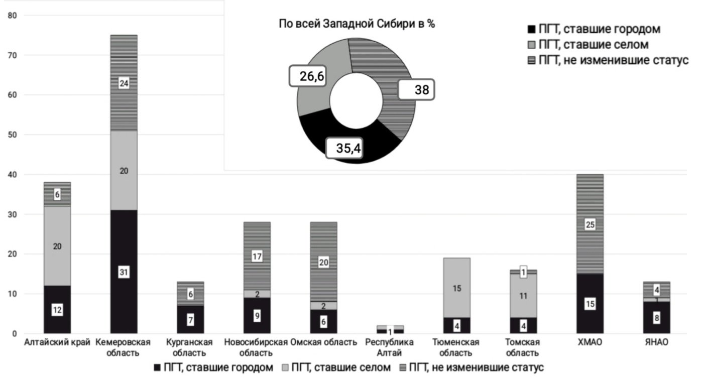 В целом процесс трансформации сети поселков городского типа в регионе проявлялся по-разному. В Тюменской, Томской областях и Алтайском крае в результате административно-территориальных преобразований середины 1990-х гг. количество ПГТ сократилось в 2–6 раз. Причинами резкого сокращения стало включение части рабочих поселков в состав городов, банкротство градообразующих предприятий, а также активная позиция местных органов власти и самих жителей, заинтересованных в переводе поселка из городских в разряд сельских.